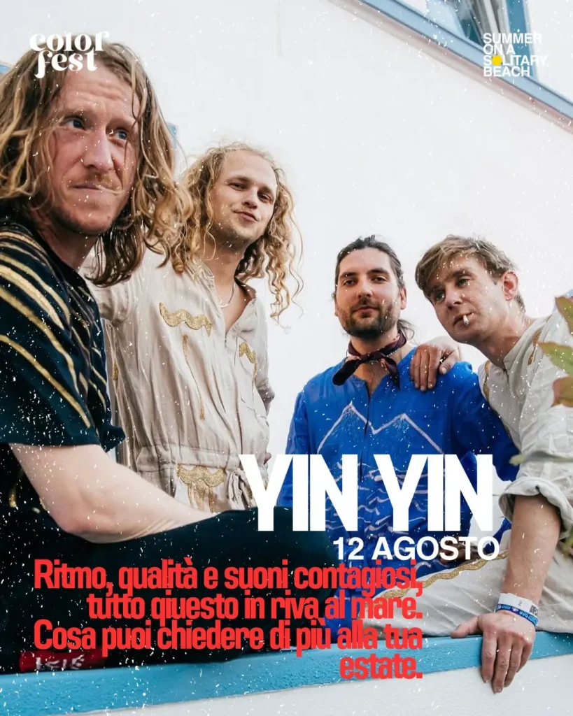 Nel gennaio 2026 hanno pubblicato il loro quarto album, “Yatta!”, il loro lavoro più maturo e travolgente: un disco che attinge all’italo disco, al surf e al funk cosmico, registrato in presa diretta per catturare l’energia della band dal vivo. Sul palco, i Yīn Yīn trasformano ogni concerto in una festa collettiva. Ritmo, qualità e suoni contagiosi, tutto questo in riva al mare: cosa puoi chiedere di più alla tua estate?