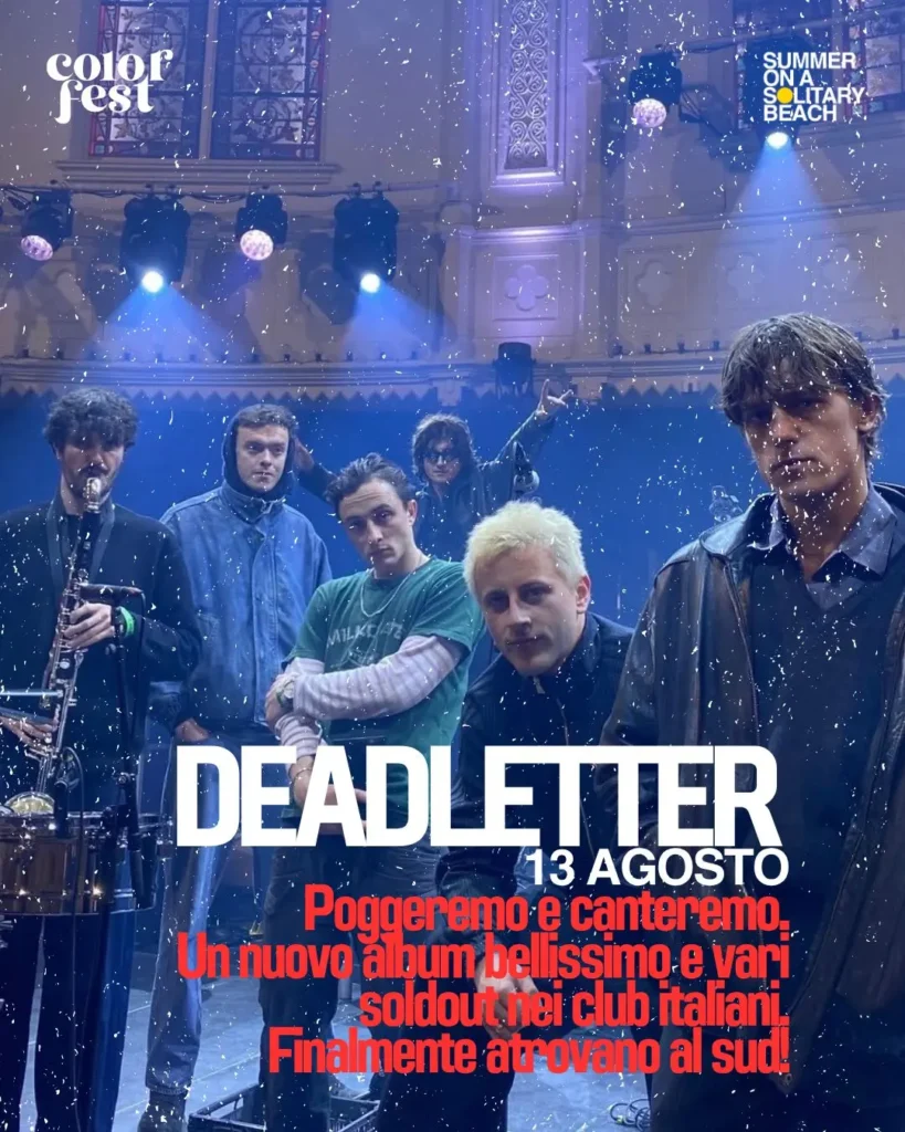 Con oltre 200.000 ascoltatori mensili su Spotify e una serie di sold out nei club italiani, i Deadletter sono una forza dal vivo che va vista per essere creduta. Il Color Fest li porta finalmente al sud: poggeremo e canteremo.