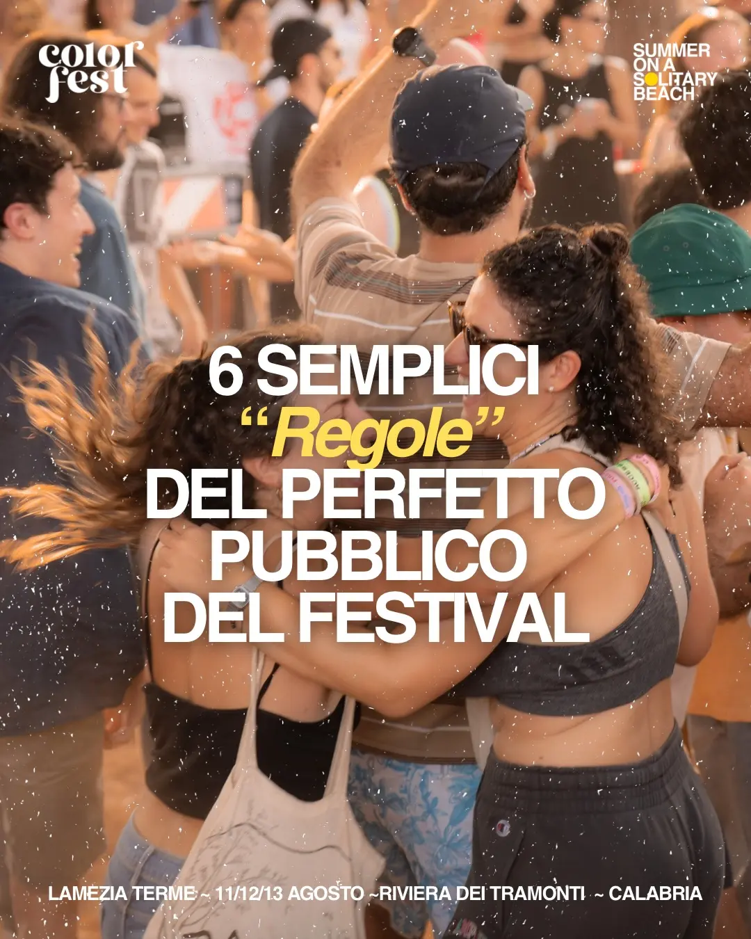 En Fiesta del color no es sólo un festival: es un comunidad. Un lugar donde la música, la naturaleza y la gente se encuentran en el Riviera de los atardeceres, entre el pinar y el mar de Calabria. En catorce ediciones, hemos aprendido que el público es el verdadero corazón de todo. Así que aquí están: seis sencillas “reglas” - más que reglas, consejos de corazón: para vivir mejor la Colour Fest 14programado 11, 12 y 13 de agosto de 2026 en Lamezia Terme.